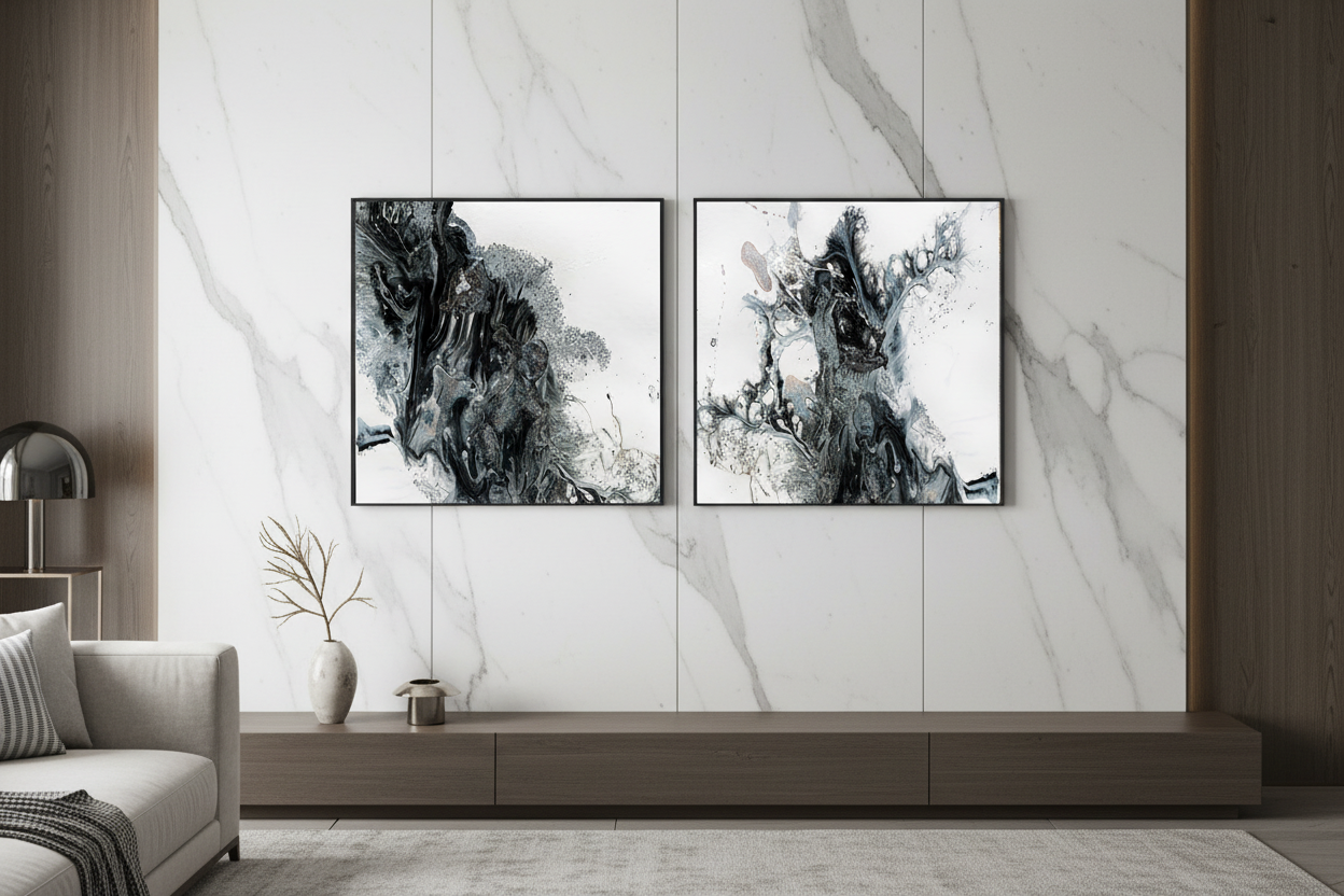 Two Contemporary Artworks by Fine Artist Julia Apostolova with Metallic Silver Accents and White/Gray and Black Color Shames.