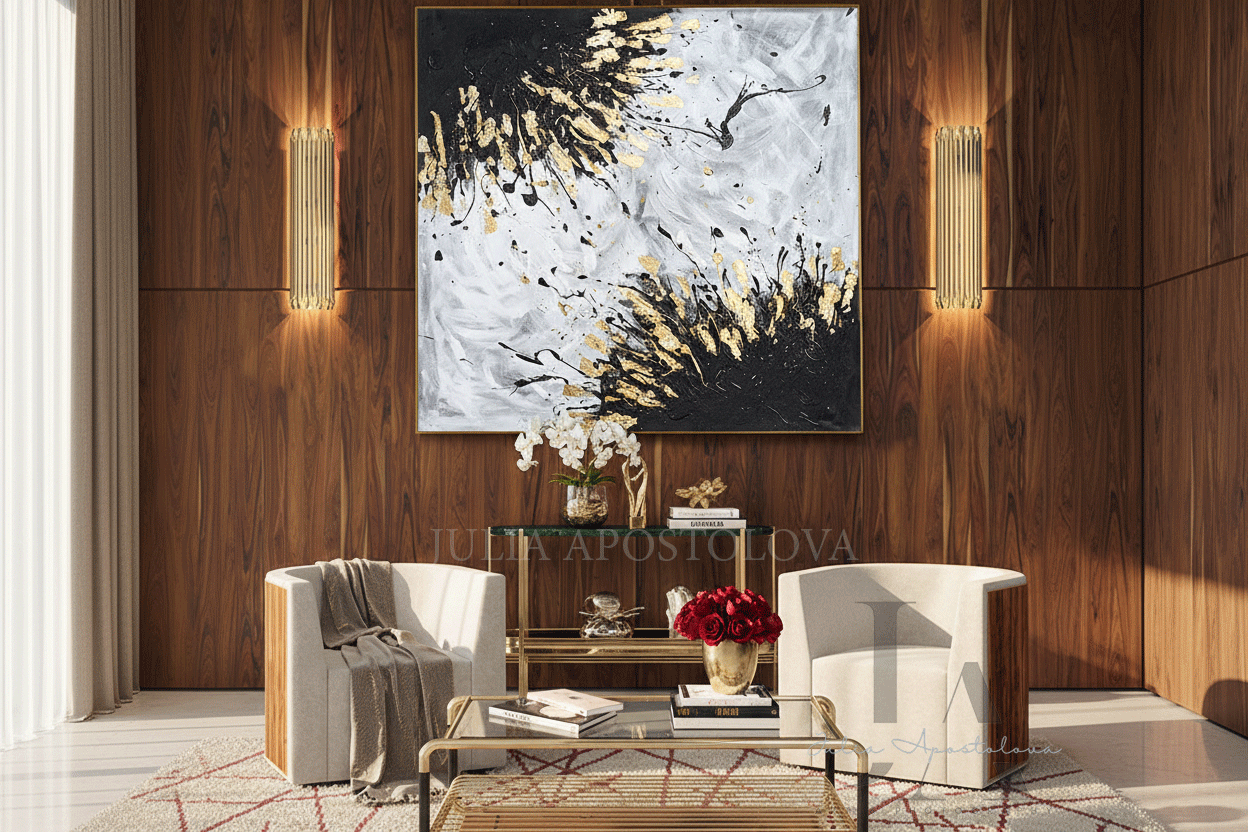 Extra Large Original Gold Leaf Abstract Painting with sheets of 24K Pure Gold Leaf, oil, acrylic, pigments on highest quality Linen Canvas and beautiful painted textures by artist Julia Apostolova, will be a stunning statement to your interior decor!